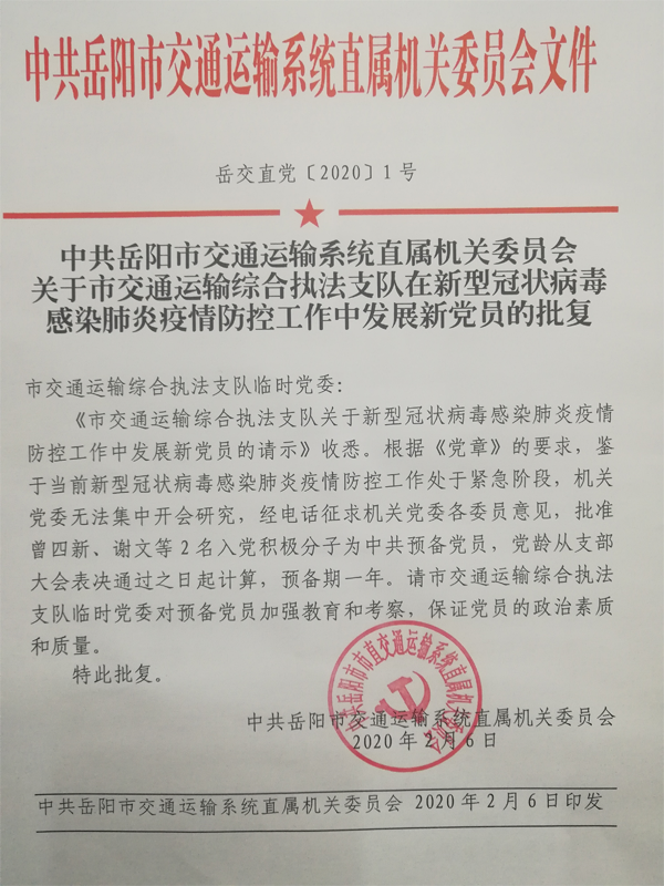 经报请市交通运输局党组批准同意,该支队党委指导基层党支部,严格按照疫情防控一线发展党员程序,发现、培养、锻炼和考察入党积极分子,将表现突出、符合条件的曾四新、谢文两名入党积极分子发展入党。曾四新同志是该支队货运物流大队的中层骨干,在许广高速收费站卡口执勤点恪尽职守、冲锋在前;谢文同志是支队机关后勤装备科的青年干部,负责防疫物资的采购和分发,舍小家为大家。吸收他们入党,为党组织注入了新鲜血液。该支队党委书记、支队长范律向他们表示热烈祝贺,希望他们在预备期和今后,不负组织期望,严格要求自己,进一步加强党性锤炼,争当一名合格党员。