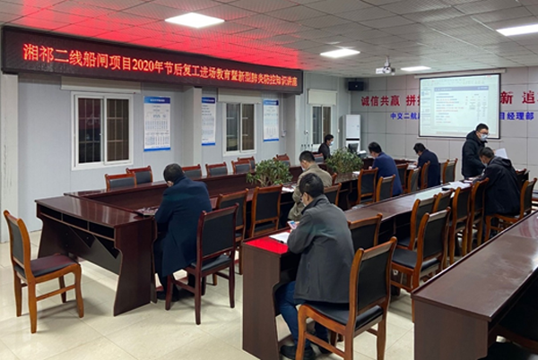 科学部署,人员有序返岗。疫情就是命令,防控就是责任。春节假期未过完,项目各参建单位负责人提前返岗,靠前指挥,每日碰头分析研判防疫形势,调度安排项目建设工作。项目建设部确定了“人员适度调整,分期分批返岗,施工作业逐次展开”的原则,首批管理人员到岗后,立即开展防疫方案及预案编制、防疫物资准备、进度计划调整、防洪度汛方案编制、复工条件检查等准备工作。在所有准备工作完成后,2月14日,完成教育培训的第一批工人正式进行施工作业。