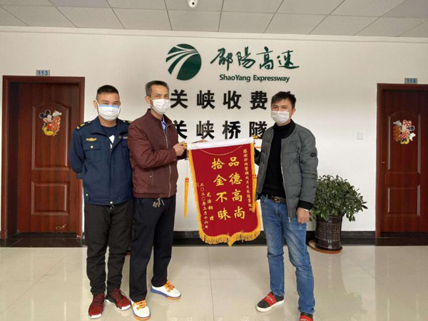 “感谢你让我的财物失而复得,邵阳高速人好样的!” 2月19日上午11时许,失主龙先生在邵阳管理处关峡桥隧所领取丢失的钱包时,对养护员陈国庆连连称谢,并送来一面“拾金不昧 品德高尚”的感谢锦旗!