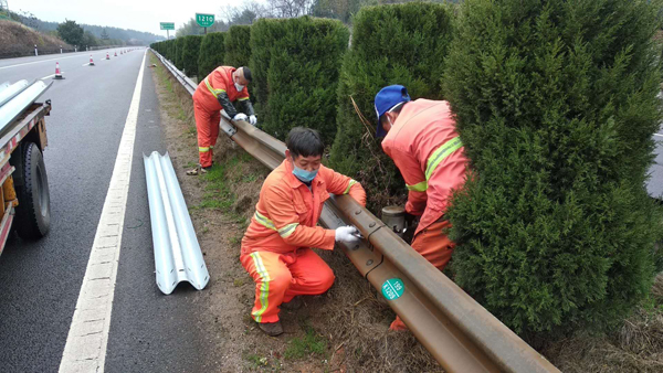 在抓好疫情防控的同时,突出抓好春运保畅工作。加大路面保洁,垃圾分类、及时收集并清运,重点做好停车港湾的卫生防护工作,给公众出行营造良好的环境;加强路面巡查,对重要路段、桥梁加大巡查密度,及时处置坑槽、沉陷等路面病害,快速修复损坏设施,做好路面养护提升和交安设施保养与维护。初步统计,2020年春运期间共修补坑洞24处,修复波形护栏62块、刺铁丝672米、隔离栅179块、柱式轮廓标69根、防眩板62块、PU柔性立柱97根,更换防抛网771㎡、防撞桶231个、水马365个。