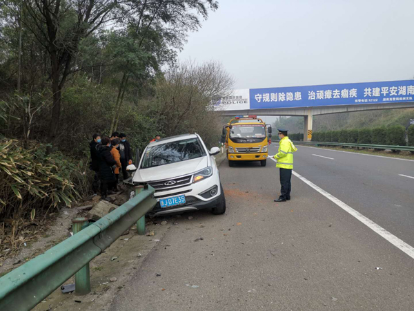 2月27日上午10时,正在路上例行巡查的醴陵路政大队人员接到报警电话称,沪昆高速醴潭段K999+435M往东处发生一起小车撞护栏事故。接到报警后,路政人员迅速赶往事故现场,并通知救援公司进行施救。