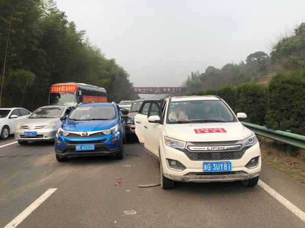 由于近期疫情复工车流量较大,在等待吊车救援过程中,超车道一台小车突然紧急刹车停下来围观事故情况,这一脚刹车直接导致后方四台车连环追尾,造成一名司乘人员受轻伤。