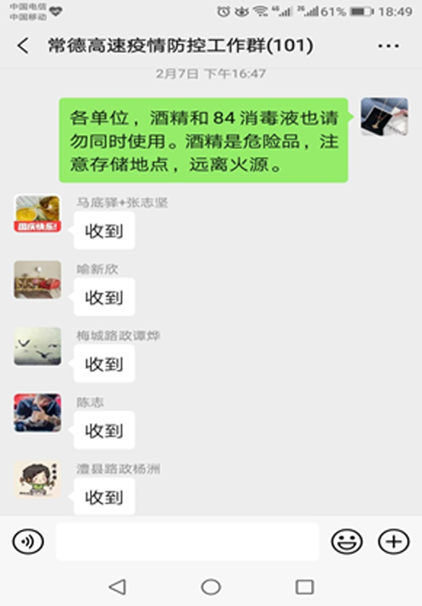 “请各单位领取防疫物资,并科学、合理使用”“84消毒液和洁厕灵、酒精不能同时使用”“酒精不能大面积喷洒,远离火源”……每天,都能在常德高速疫情防控工作群听到她的“碎碎念”。