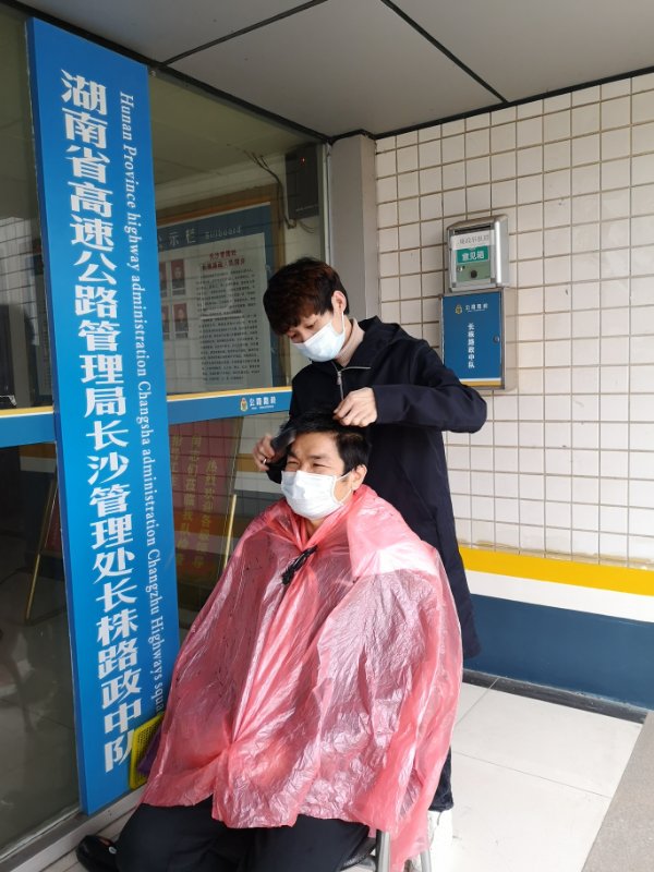新冠肺炎疫情仍在持续,多日来长株路政全体路政人员一直坚守岗位,既无暇也无条件外出理发。随着时间的推移,理发成为了大伙的一大难题。3月5日这天,长株路政大队食堂后勤人员张必文见此情形,主动将他当发型师的儿子李俊从家里叫过来,热心地张罗着为大家提供免费理发服务。