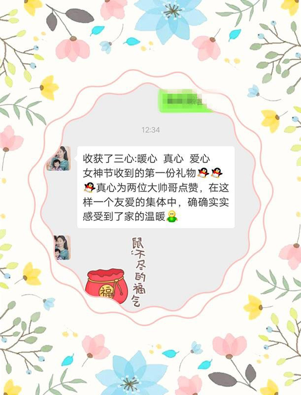 神秘礼物?大家纷纷跑去办公室探究竟,第一个出来的是齐月玲,齐班长拿到礼物后心里美美的:“我要稳稳地幸福,能抵挡末日的残酷……”她哼着歌在班级群里感言道,“两位站长真有心,女神节我收到了专属自己的神秘礼物,同时收获了:暖心、真心、爱心。为两位大帅哥点赞,在这样一个友爱的集体中,确确实实感受到了温暖。”