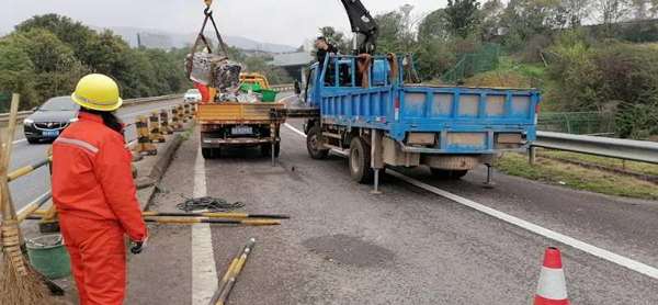 由于事发现场掉落废铁块较重,人力无法迅速展开有效清理,但险情就在眼前,抢险刻不容缓。应急抢险组边行车边布置,赶到现场后分工明确,各司其职、各尽其责,养护工人一边摆放安全锥筒、警示标牌,有序组织现场交通疏导和安全防护;一边运用撬杠绞索协助吊装车展开清理作业。经过不到一个小时的战斗,废铁块得以彻底清除,辖区道路恢复畅通,及时保障了过往司乘人员的生命财产安全。