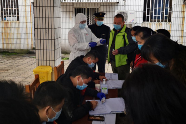 县交通局十四名工作人员其中有六名党员年龄最小的26岁年龄最大的56岁由二名副局长带队,在大年三十进驻火车站防疫点。在对进出火车站的旅客进行严格测温的同时,将旅客的信息进行逐一核对登记,并详细询问乘车轨迹是否到过疫区等情况。对体温异常的旅客采取临时观测和暂时隔离等措施。在他们办公桌后面的五米外是车站出站口的大门,也是通向健康和县城百姓的平安大门,他们用忠诚在守护人民的平安。由于复工复产外出人员增多,疫情防控点的工作量逐渐加大,一日三餐方便面是常态,但他们没有一丝怨言。在靖州车站每天有八对旅客列车停靠,最早凌晨二点和最晚11点30分,时间跨度大休息时间少,但他们为了打通最后五米安全通道,用责任和担当为全县老百姓坚起一道坚固的安全屏障。