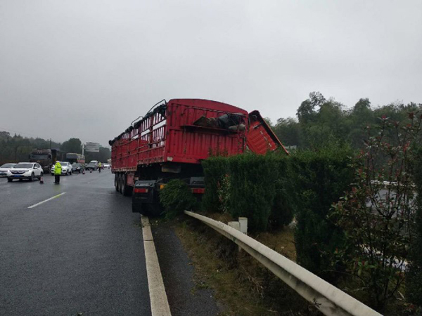 据现场路政员介绍,事故车辆横亘在中央隔离带上,占据对面北向超车道和一条行车道,车头严重受损。所幸该车空载,惯性作用相对较小,并未造成人员伤亡,但路面中央绿化隔离带因此大面积损毁。