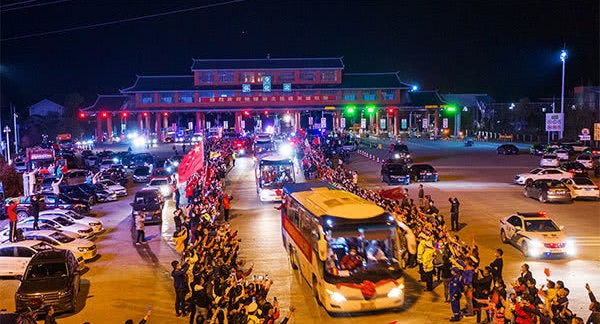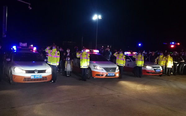 22时33分,车队在交警车的引导下,缓缓驶出怀化北收费站出口,现场瞬时沸腾起来,致敬声、欢呼声、锣鼓声,交织在一起,在此迎候的高速路政、交警、怀化北收费站人员夹道向抗疫英雄们敬礼,并与手持欢迎标语的怀化市民一齐高呼:“向英雄致敬”,欢迎他们载誉返怀,目送着车队在迎宾骑警的护送下,驶向市区,场面十分令人感动。
