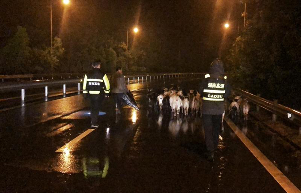 4月20日19时许,湖南高速公路集团有限公司常德分公司桃源路政大队、桃源养护联合巡查至G56杭瑞高速东往西方向K1043M处时,看到一群羊在高速公路上悠闲漫步,其中几只羊在护栏边啃食绿草,过往车辆纷纷避让,现场随时可能发生危险。