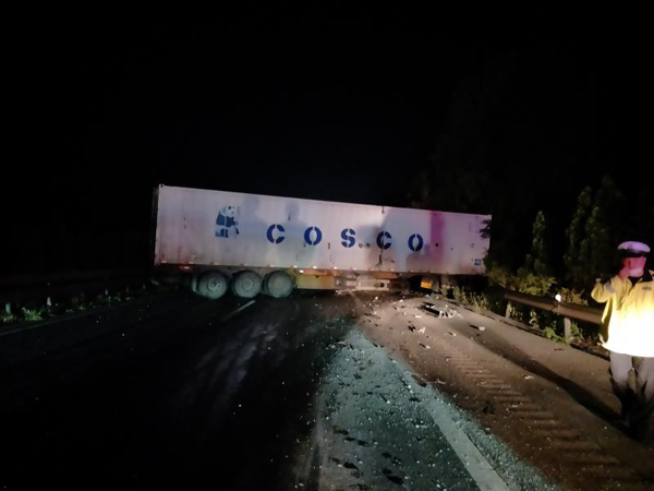 湖南高速岳阳分公司大荆路政大队的路政员张炯和钟卓亚赶到事故现场时,只看到了满地狼藉。装载整车梨子的集装箱货车车头撞上了右侧护栏,完全变形,车厢横在高速路面占据了快车道、超车道和应急车道,造成往南交通阻断。地面上除了货车车头的铁皮之外,还有近100平米的油污撒在路面上,给道路抢通和施救带来了极大的难度,而司机李师傅也因受伤被迅速送往医院进行救治。
