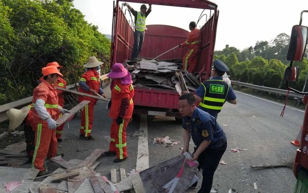 19时16分,在各部门人员的合力处置下,车辆救援车将事故车拖离现场,养护人员将车道内坠物、事故残渣清理完毕,现场交通随即恢复正常通行。
