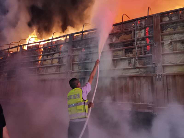 接警后,高速路政、消防、交警等部门第一时间赶到现场,进行人车分流,经过消防救援人员水枪扑救,火势得到控制,无人员伤亡。目前,事故正在调查中。