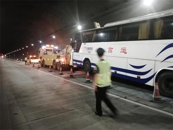5月31日22时07分,湖南高速公路集团娄底分公司邵阳西路政大队接警称,一辆大客车在G55二广高速安邵段花山隧道内发生故障,停在行车道上,没有采取任何警戒措施,情况十分危险。