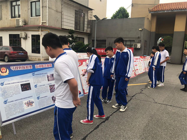 同学们认真观看交通安全宣传展板