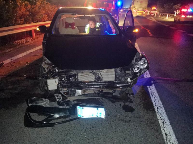 抵达事故现场后,只见前方被追尾的黑色小车车头撞在了路肩防护栏上,损毁严重,后方追尾小车车头损伤也不小,但所幸没有人员伤亡。