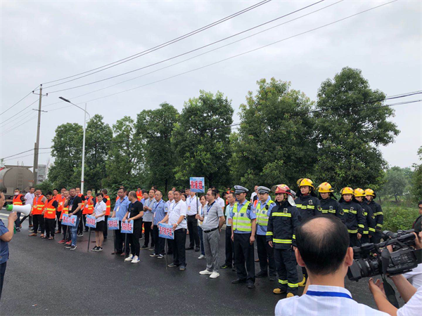 此次演练模拟一辆槽罐车在交岔路口因违规行驶与中型客车相撞,紧接着两小型汽车追尾,导致槽罐车、中型客车与两辆小型汽车内乘客严重受伤,酿成四车受损的交通事故。接警后,公安、交通、消防、应急等部门迅速出动。公安、交通部门对事故路段进行交通管制,分流过往车辆,现场进行清障;消防救援人员迅速对现场槽罐车罐体进行稀释降温、冷却抑爆;“伤者”也被医护人员火速送往医院进行救治。不到半小时,火源就被扑灭,事故现场隐患全部排除,“伤员”也成功脱险。
