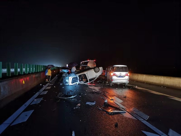 7月10日20点55分,大通湖路政大队接南县交警来电,称华常高速南益段南往北方向K55+380M处,发生三台小车相撞事故。