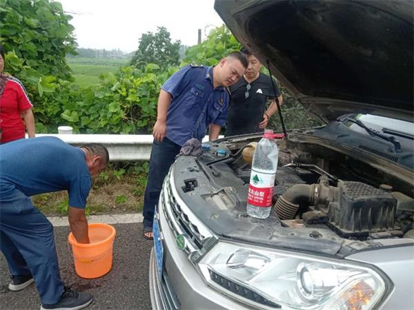 “你好,我们是从山东省济南市来湖南自驾游的旅客,今天上午从韶山毛主席故居出来,顺着G60沪昆高速转G0421许广高速,到雷锋的家乡望城看看,可是车子过了雷锋服务区不久后,发动机盖突然冒白烟,我当时还以为着火了,吓死了,等车子靠边停稳打开引擎盖,拿出灭火器准备灭火的时候,才发现是开锅了,又不敢再继续跑,就推着车下来了,我还在路边捡了不少水瓶,准备搞点水,再倒进去试试,能不能继续跑”年长的驾驶员一边喘着粗气一边汗如雨下的说道。