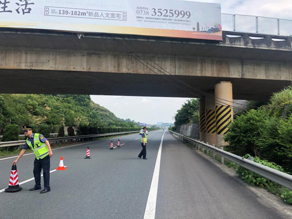 7月18日上午,路政人员联合养护单位制定拆除计划,开始对该违规水管进行拆除。由于水管有一段悬挂在半空,路政人员将现场临时压缩一条行车道,并做好车辆指挥和示警,养护人员则在无车辆经过时将水管切断,并迅速将切断的水管撤离高速,约十分钟后,所有水管全部拆除完毕,现场恢复通行。