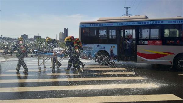 上午9点,县局指挥中心王海鸥总指挥长警令下达,演练正式开始。此次演练主要模拟场景为:在衡山大道体育馆路段,一辆装载易燃易爆物品的运输货车与一辆公交客车相撞,导致危化物品泄露燃烧,且车内有2名受伤群众,随即公安、消防、医护、道路救援人员协同配合开展营救。各单位接到指令后,按照《衡山县公安局关于运输危险化学品车辆交通事故现场处置工作预案》的要求迅速投入应急处置工作。交警大队对事故现场周边道路实施了交通管制,封控现场,建立救援通道;治安大队、两路口派出所对现场围观群众进行了疏散;消防大队到达现场后,迅速转移受伤群众,用消防水枪对危化物品进行了稀释,降低毒物浓度,防止爆炸事故的发生,并掩护医护人员对受伤群众进行医救;医疗救援组即刻将受伤群众抬离现场,并将受重伤的群众送往医院治疗。