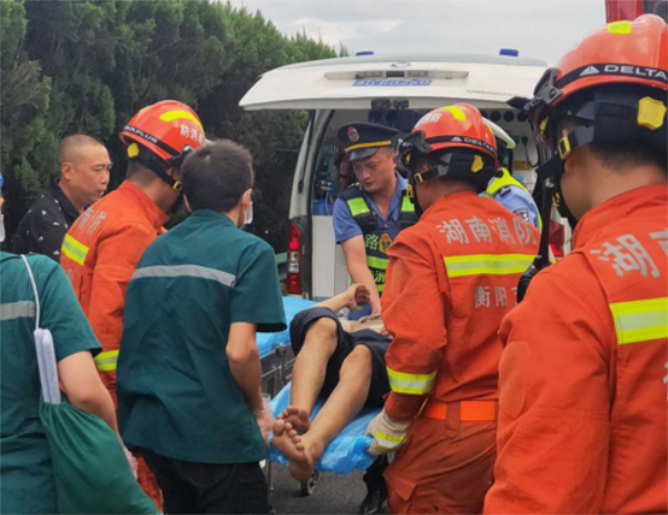 施救、养护、120急救、衡阳消防纷纷赶往事故现场,消防员用工具将受损大货车门锯掉,救出受伤司机,然后,120急救直接送往当地医院,马上,施救、养护立即清理路面,将追尾大货车拖离事故点。经过一个多小时后,事故现场恢复双向正常通行。据悉,事故货车司机是因疲劳打嗑睡,完全没有踩刹车,从而直接追尾撞上前方半挂车。该事故造成货车司机轻伤。