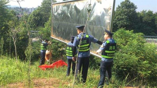 针对这一情况,邵阳南路政大队迅速开展违建广告牌专项整治行动。在多方寻找广告牌构筑人无果后,于8月2日上午,组织人员对违法广告牌进行依法拆除。有效的消除了安全隐患,维护了道路安全。