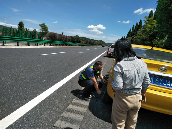 为保障安全,李震请女车主将其车辆双闪灯打开,并在故障车辆后方150米处摆放了警示三角标志,提醒后方车辆减速慢行。在得知驾驶员不会换胎后,李震从巡逻车里拿出了简易工具,并现场教学如何更换轮胎以及换胎过程中应注意的安全事项,莫贻兵在车辆后方示意车辆减速慢行,不到10分钟就更换好了备胎。