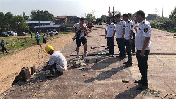 (专业人员在执法队员的监督下对“三无”船舶船体进行切割)