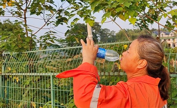 14:30,路侧的树叶垂头丧气的打起了卷儿,扑面而来的热浪令人眩晕。保洁员开始下午的工作模式,半小时不到的时间,衣服就已全部湿透。“下午这个时候是一天中最难熬的,虽然衣服已湿透,粘在身上很不舒服,但为了安全仍需要穿着,工作也得继续。有时候实在累了,就在树荫下乘下凉,吃点随身携带的防暑物品,之后再接着干。”朱享初说道。