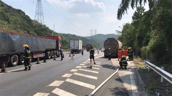 20分钟左右,各部门工作人员陆续赶至现场。救援部门先行将侧翻小车拖离现场。针对疑似发生汽油泄漏的油罐车,各部门迅速确定现场处置方案。为降低危险系数,消防人员在做好充分的降温、灭火准备的同时,各部门工作人员协同将卡入货车后轮的保险杠撬出,将油罐车成功转移至隧道外停车港湾,再由消防员展开安全检测。