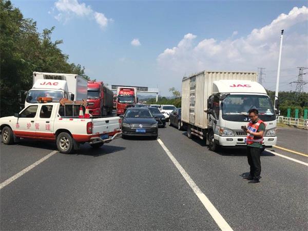 根据现场情况,现场养护员立即通知路管、消防、高速交警、施救等部门前往支援。为避免二次事故,养护队员兵分两路,一组紧急引导滞留在隧道内的车辆及人员安全撤离;另一组经授权后,从高速应急回转车道绕到隧道入口处,对事故现场后方车辆全部进行截流。