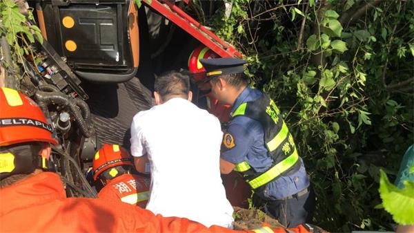 见此情形,路管员立即察看事故车辆人员伤亡情况,其中一人头部和手轻微擦伤坐在路面应急车道上,护坡下二名驾驶员都卡在车内,不停呼出求救的声音。