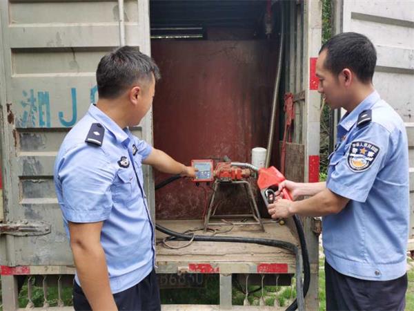 9月3日,芙蓉派出所民警接到群众举报称,在辖区高泗社区8组某巷子内有人开着一辆灰色小货车售卖低价汽油。获悉情况后,所长龙占学高度重视,当即指挥民警对此展开调查。通过连续侦查,民警发现该巷子内,长期停放一台改装的灰色小货车,货厢中暗藏一汽油存放铁油罐、加油机等工具,还有两名男子为前来的车主加油。