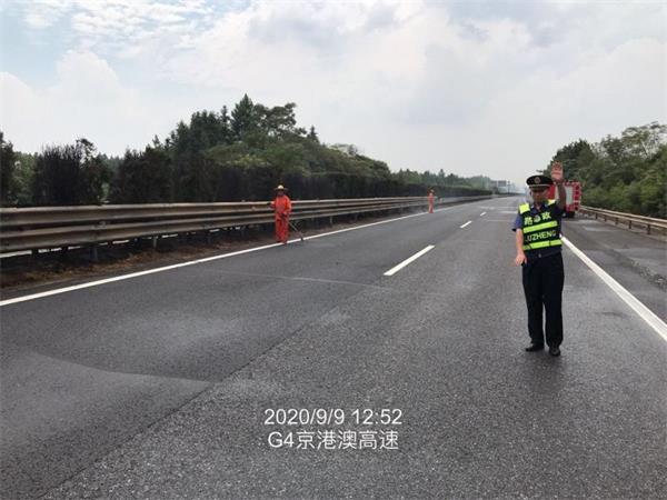 9月9日12时10分,湖南高速集团岳阳分公司临湘路政大队接到报警,称在G4京港澳高速岳阳段K1370+500M处的中央隔离带发生火情,火势较大,需对现场过往车辆进行交通管制,临湘路政大队值班队员立即赶往现场。