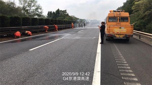 由于火势较大,路政、交警、消防、施救四方经过近一个小时的施救,于13时13分将明火全部扑灭,并对现场进行浇水降温,避免死灰复燃。现场火势被控制后,交通管制也随之解除。由于扑救及时,现场未造成二次事故。