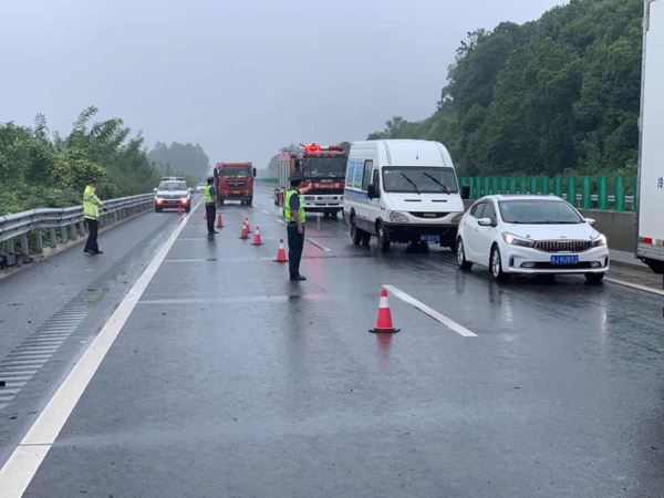 10点38分明火扑灭。10点45分在现场交警、路政的指挥下开放超车道放行滞留车辆。此时,大通湖路产大队全体人员均在现场维持秩序与清理事故现场垃圾,保障顺利抢通因事故而中断的南益高速路段;
