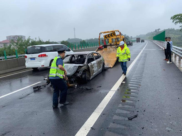 该次事故据驾驶员自述,行车至事发段时由于操作不当,车辆撞向右侧波形护栏,随后听到发动机异响并冒起浓烟,无奈车上没有配备灭火器,只能眼睁睁看着车辆烧毁。车上两位人员因及时爬出小车,滚到护栏外,没有造成重大伤亡,但手臂均有小面积的烧伤。该起事故在各联动单位的快速处置下,没有发生二次事故,短短一个小时内,快速成功处置了事故现场,确保了道路的安全畅通。