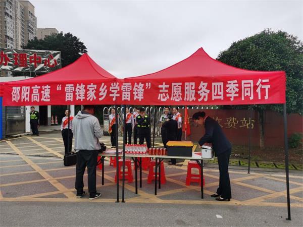 15时许,邵阳南收费站广场悬挂起“雷锋家乡学雷锋”志愿服务四季同行横幅,志愿者身披红丝带,在收费站外广场设置了志愿者服务台,向过往司乘人员送去王老吉、矿泉水等物资,并致以节日的问候和祝福。志愿者“小姐姐”耐心地为司乘人员解答国庆中秋“双节”易堵路段预测及绕行方案,挨个向他们发放路网地图。热情、细致、周到的志愿服务受到过往司乘人员的纷纷好评。