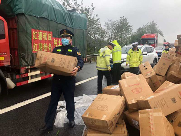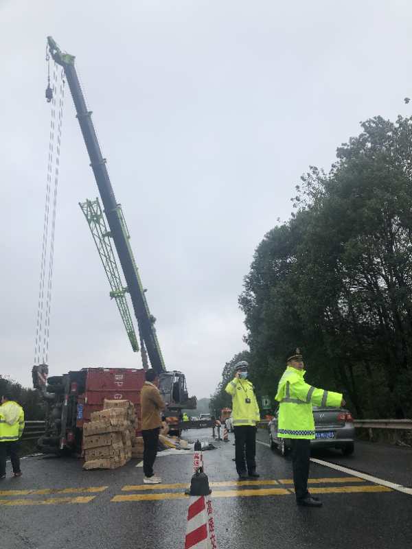 在现场,短短几分钟时间里,在现场所有人员共同努力下,迅速抢通了应急车道。由于受疫情影响,加之今年国庆中秋相遇,辖区车流量比往年有所增加,现场临时指挥部商议决定,采取在板仓收费站进行交通管制及分流的方式,以确保不发生大面积、长时间交通拥堵。同时,为加快现场清理及减轻货车驾驶员的经济损失。在路产队员、交警、施救、养护的齐心协作下,在11时30分,事故现场处置完毕,恢复通行。事故车辆驾驶员感激地说道:“咳,不幸中的万幸是遇到了您们,要不是您们快速出警,快速处置,今天还不晓得要闯多大的祸,真的谢谢您们!”