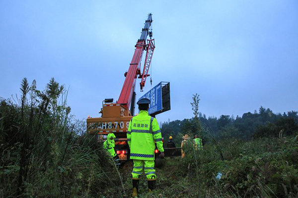 节假日不仅仅只有保畅,维护路产权益也刻不容缓。早在“两节”之前,彭迪辉带领队员开展安全隐患排查时,就在辖区内发现了一个违法建造的广告牌。在下达《限期拆除通知书》并与责任人多次沟通无果的情况下,彭迪辉主动和当地交通执法部门对接,决定采取强制拆除措施,整治顽瘴痼疾。
