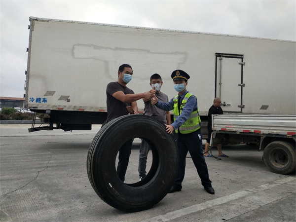 10月2日,回龙圩路产大队在道县服务区值守时,发现A区一辆装载冷冻食品的货车需要更换轮胎,路管员阳洪棣主动上前帮助司机从B区车辆修理厂搬运新轮胎到A区进行更换,获得司机点赞。