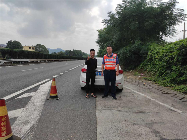 10月1日,在道贺高速南往北方向K11+805M处,回龙圩路产管理大队对故障车辆进行施救监管,司乘人员对副大队长孙彦的工作服务态度点赞。