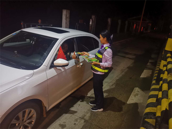 10月1日,江永收费站向过往的司乘人员赠送小国旗和节日祝福,司乘人员纷纷点赞。