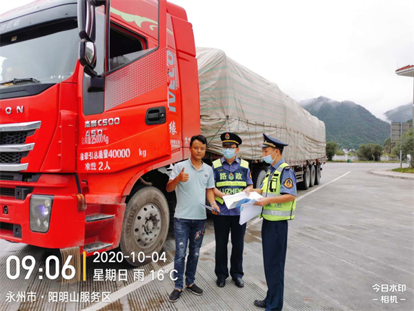 10月4日,一辆湘E98232客车行驶至阳明山服务区时突发故障,因对施救过程中产生的转运费用与施救站未达成一致,产生分歧,经阳明山路管大队协调后,双方达成协议,司机对路管员的服务态度及处理结果进行了点赞。