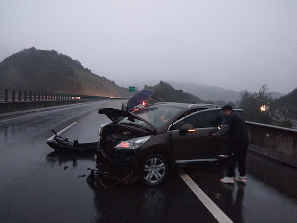 事情还要从10月5日那天说起,5日傍晚18时左右,忠防养护所队员邹碧峰、李星在巡逻时发现,G56杭瑞高速岳阳段东往西方向K773处,一辆湘籍牌照小车因雨天速度太快,撞上桥上护栏,车头严重受损,车辆无法启动,停留在行车道上。几名男子满脸焦急地站在车旁,他们安全意识薄弱,除了车辆双闪灯闪烁,车辆后方无任何安全警示标志。