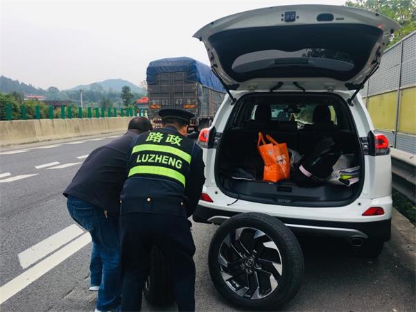 “授人以鱼不如授人以渔”,了解情况后,路产队员们转变思路,一改以往直接帮助司乘的做法。先指引其他乘客到安全区域等待,然后指导司机放置三角示警牌,协助司机利用车载设备更换备用轮胎。只用了十分钟左右,轮胎便更换成功。换胎期间,路产队员不仅向司机教导换胎上的经验和技巧,还向司机介绍了高速路上突发应急状况的处理办法和方式。