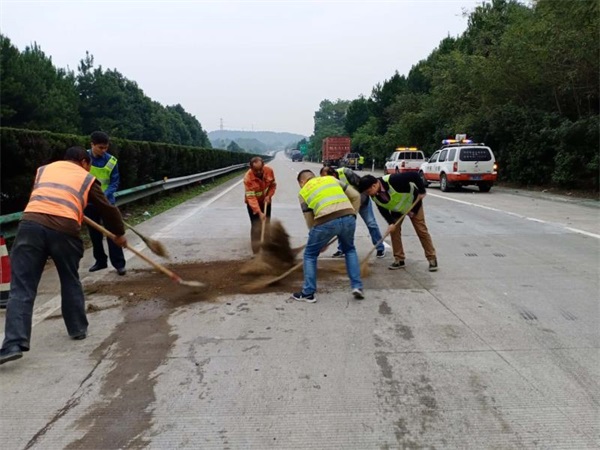17时08分,在交警现场勘查完成后,养护时人员立即对事故现场周围进行清理,紧急设置出一条安全通道,保障车辆通行。同时,与交警、路产人员一道营救被困伤者,并移至路肩安全区域等待急救医护人员。