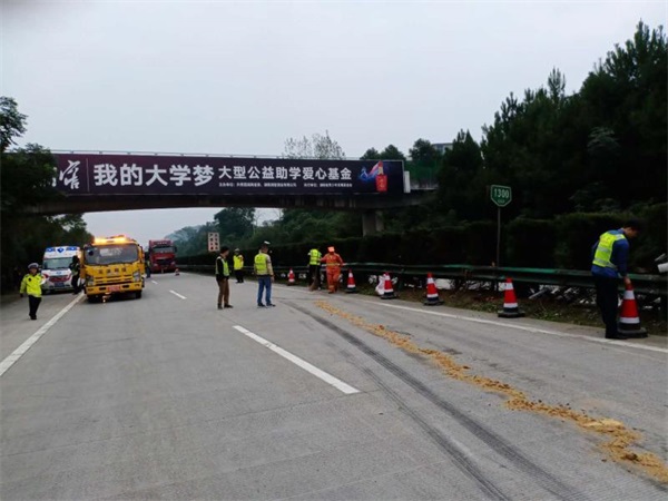 见此情景,巡逻人员立即靠边停车,在致电上报领导及交警、路政、消防、急救等部门的同时。立即从巡逻车上拿出锥形桶对事故现场进行交安维护,提醒来往车辆注意避让。并查看人员伤亡情况及车辆损失情况。