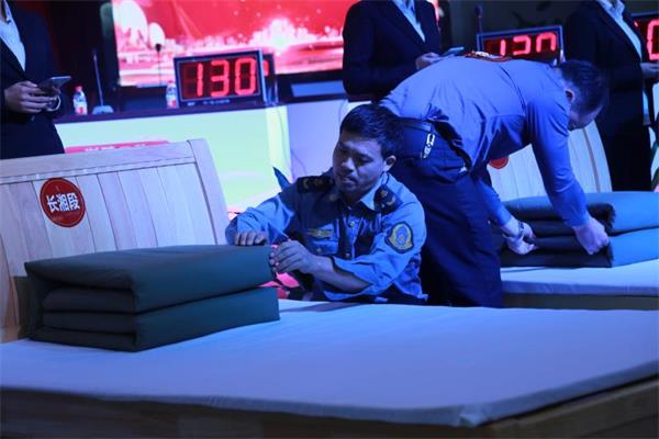 本次竞赛共设置个人必答题、抢答题、内务比武和风险题等环节。比赛现场,选手们沉着应对、睿智思考、尽展其能,表现出精湛的职业技能与满满的自信。在内务比武的叠军被环节,引得大家纷纷围观,有人甚至摩拳擦掌,跃跃欲试;穿插其间的互动答题环节,台下观众积极参与,现场气氛不断活跃;当个人必答题、抢答题环节结束时,多支队伍的成绩相差无几,比分紧咬,分差就在一道题(10分)的范围内上下波动,最后的风险题环节成为各队争取成绩领先的关键,也是全场关注的焦点,选手们积极投入、认真发挥,场上紧张的气氛感染着台下每位观众,大家时而欢呼,时而惊叹,将整场比赛推向高潮。